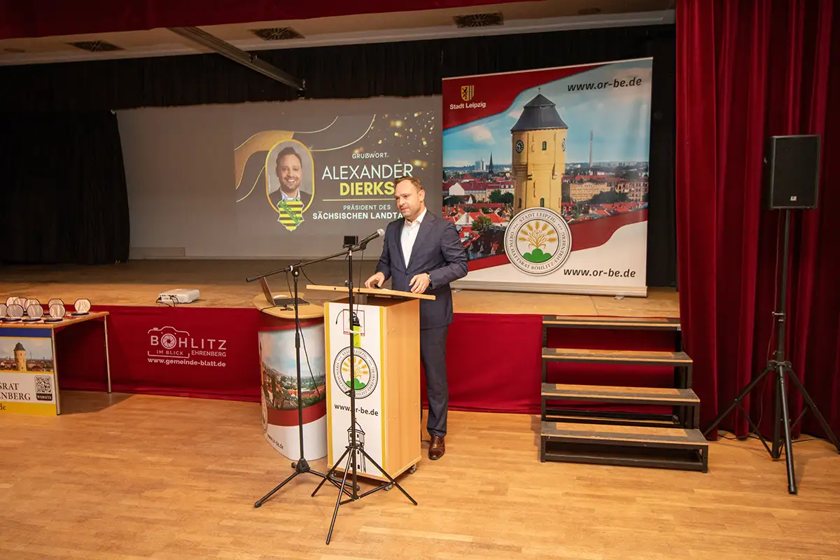 Dieser würdigte das vielfältige Engagement der anwesenden Böhlitz-Ehrenbergerinnen und Böhlitz-Ehrenberg und zeichnete ein Bild, wie es ohne Ehrenamt und Engagement im Freistaat stünde – nämlich schlecht. „Wir würden uns alle umschauen, wenn alle Ehrenamtlerinnen und Ehrenamtler nur für einen Tag sich absprechen würden und entscheiden: ‚Wir machen alle mal nichts‘. Da würden wir alle feststellen, was wir am Ehrenamt haben und woran es mangelt, wenn Ehrenamtlerinnen und Ehrenamtler ihr Tun einstellen", so Dierks. "Deswegen ist es so wichtig, dass es diese Auszeichnungsveranstaltungen gibt und einmal für den Moment sichtbar gemacht wird, was Sie alle in unzähligen Stunden für unser Gemeinwesen tun, und das eben nicht zuerst mit der Frage ‚Was bekomme ich?‘, sondern mit dem Anspruch, tatsächlich etwas für die Gesellschaft zu leisten (…). Sie sind sozusagen die Keimzelle, die Basis, das Fundament unserer Demokratie. Deswegen ist das großartig, dass es Sie gibt.“