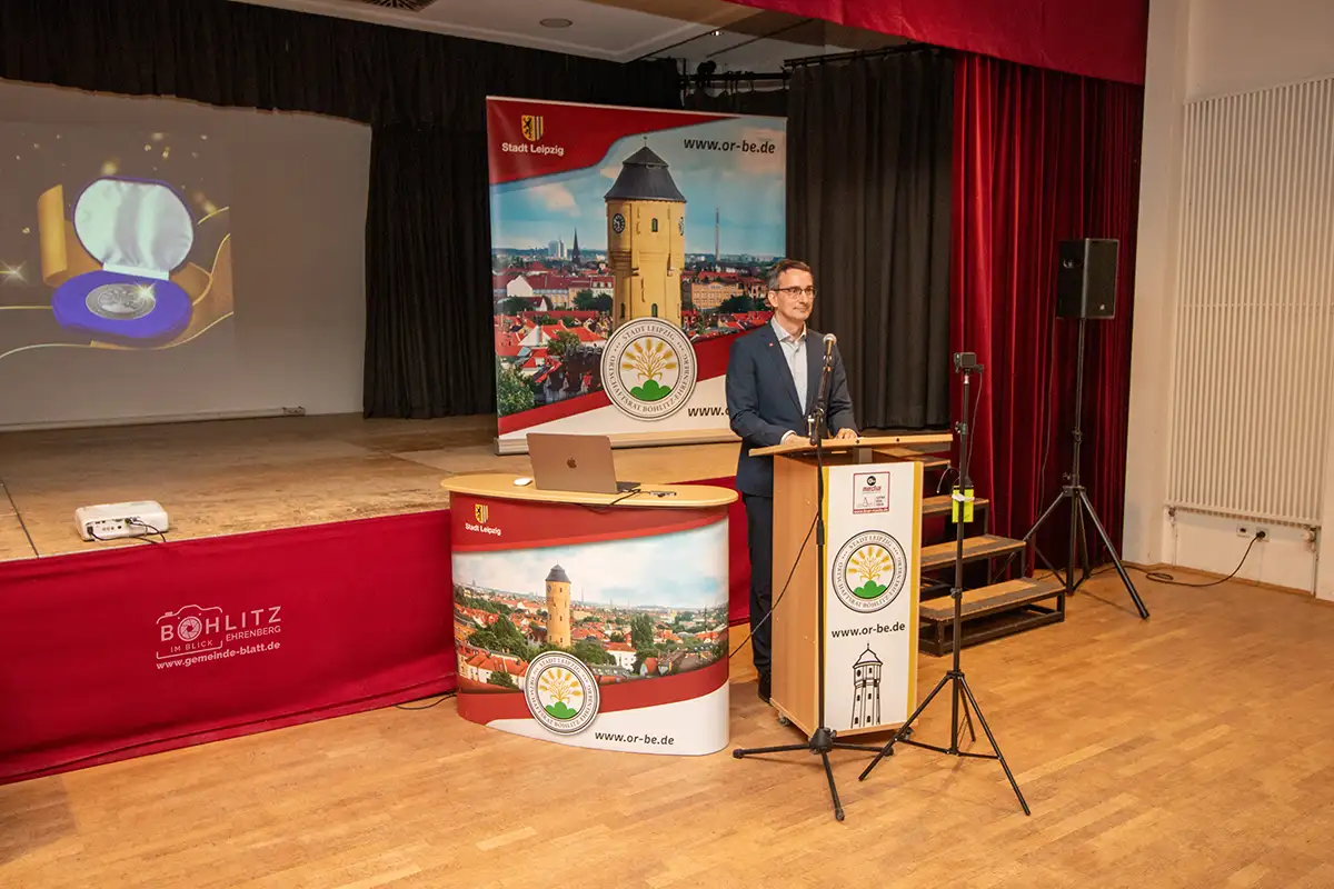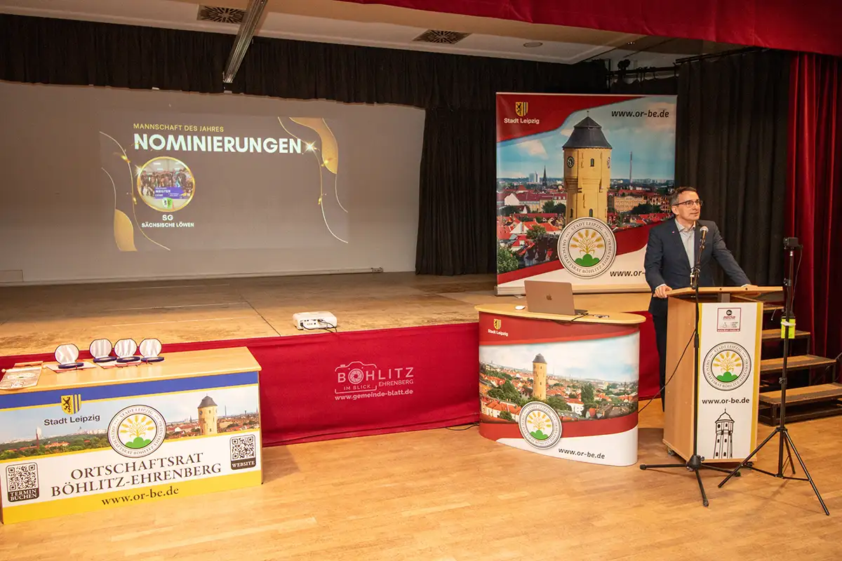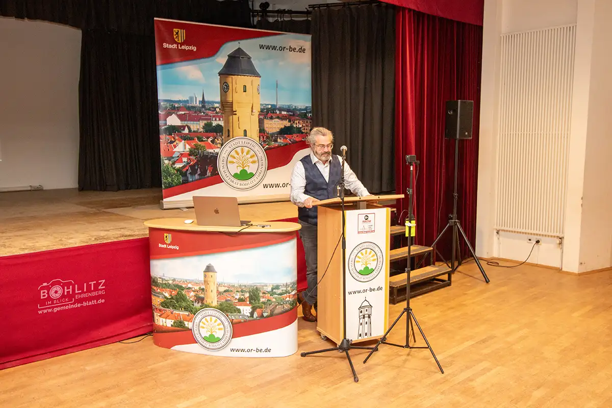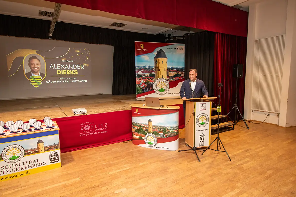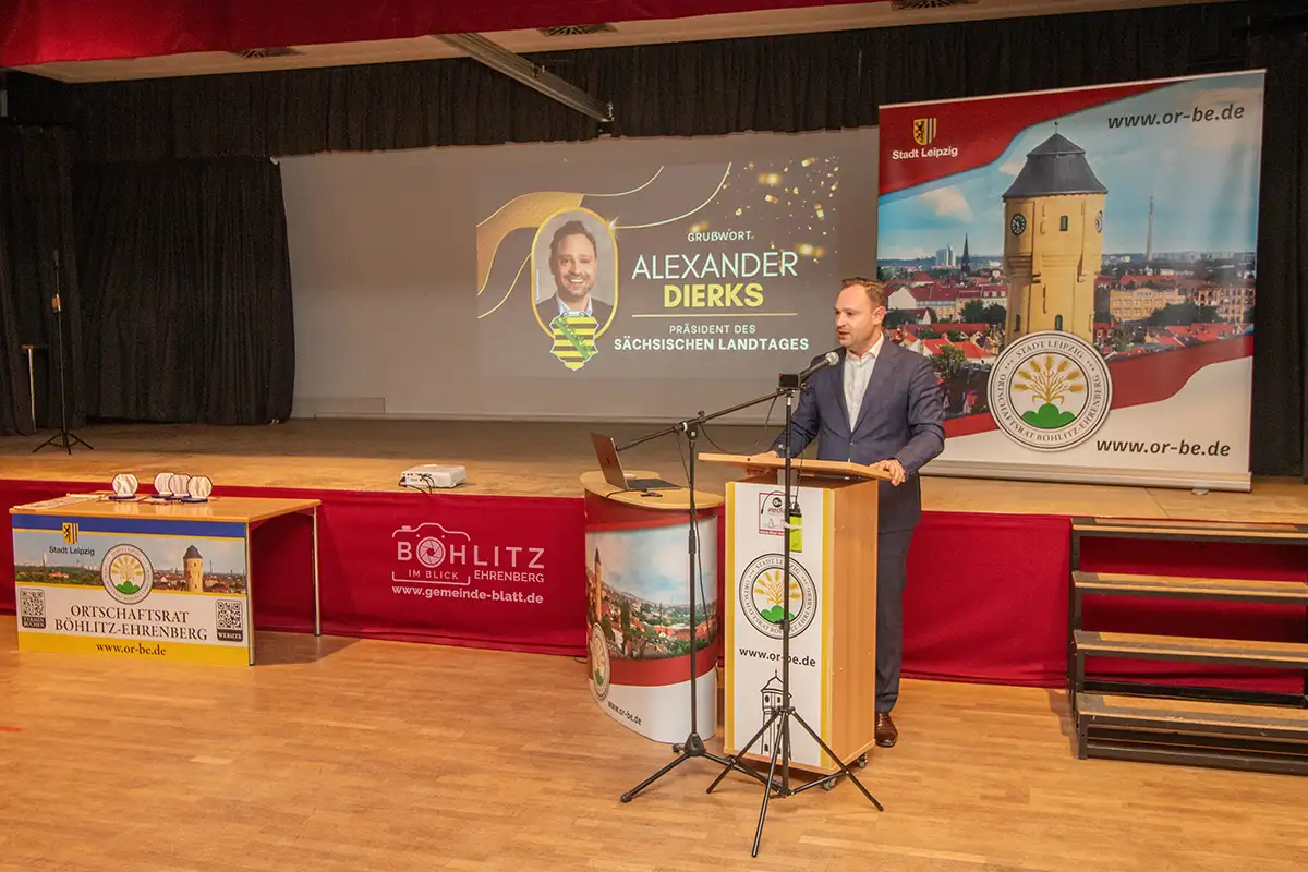 Auch Ortsvorsteher Denis Achtner würdigte in seinen einführenden Worten das Engagement der Böhlitz-Ehrenbergerinnen und Böhlitz-Ehrenberger und kritisierte die Stadtverwaltung Leipzig scharf bezüglich des aktuellen Vorgehens in Bezug auf die Brauchtumsmittel, die sich Böhlitz-Ehrenberg einst vertraglich hat zusichern lassen, die Stadt diese aber unter Haushaltvorbehalt stelle. Dies sei nicht nur rechtswidrig, sondern stelle einen Tiefpunkt des Miteinanders seit der Eingemeindung nach Leipzig dar. „Diese vertraglichen Zusagen werden somit aus der Sichtweise des Ortschaftsrates zu einer Pflichtaufgabe der Stadt, für die eben keine Haushaltvorbehalt gilt.“ Achtner spielte hier auf das vergangene Jahr an, in dem die Stadt die Brauchtumsmittel mit dem Hinweis auf den unbestätigten Haushalt der Stadt Leipzig bis weit über die Jahresmitte zurückhielt beziehungsweise nur teilweise auszahlte. „Warum greift mich das so an? Weil man damit genau diejenigen trifft, die eben diese wichtige Säule unserer Gesellschaft ausmachen, die vielen Ehrenamtler und Engagierten, und damit uns alle, die wir heute hier versammelt sind."