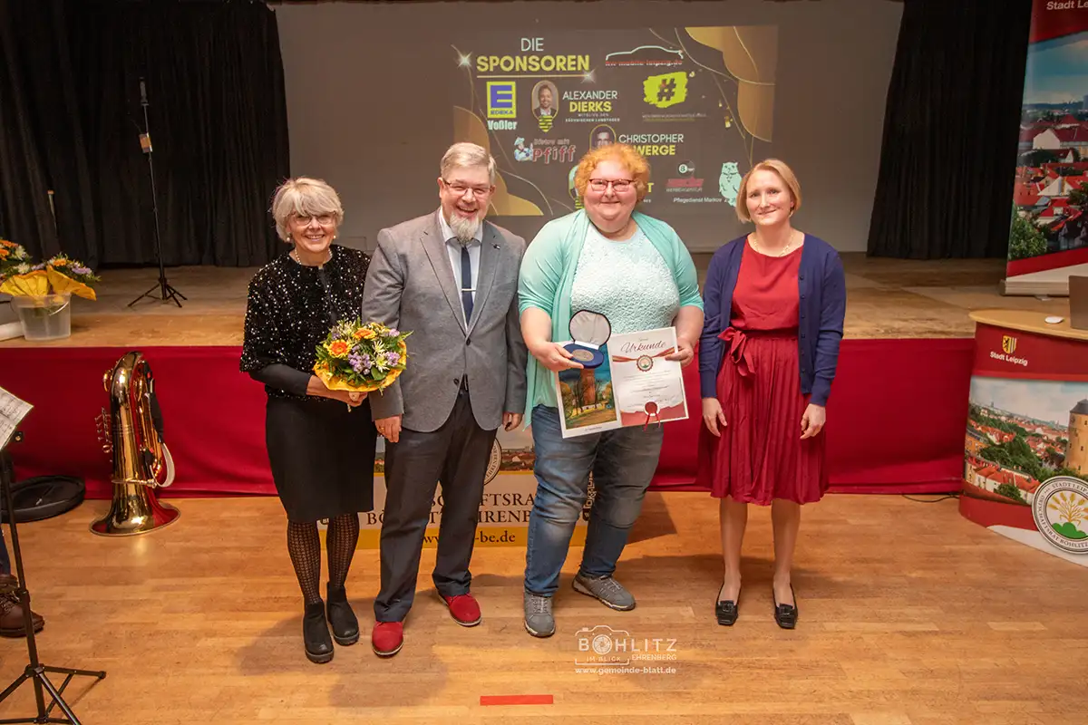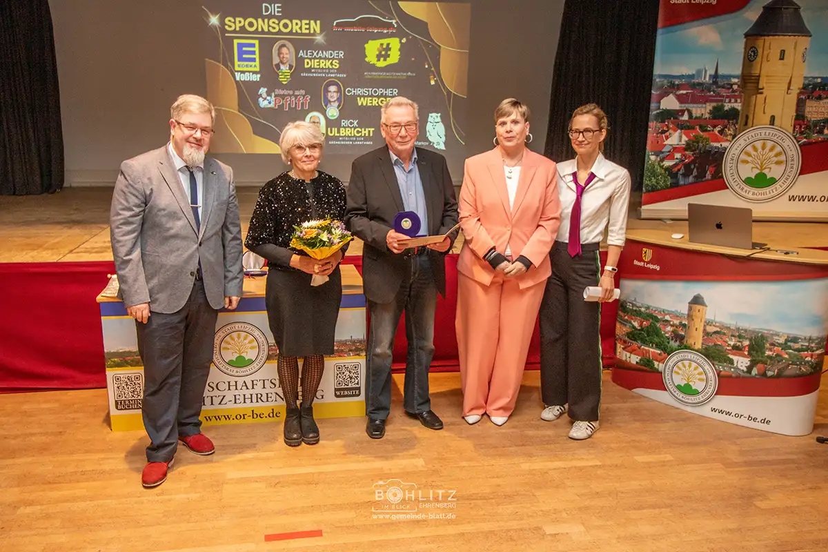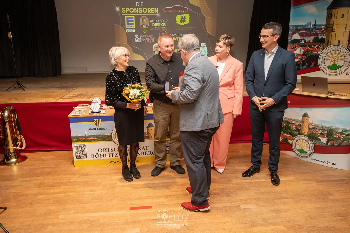„Ich wollte doch heute hier nur ein Gläschen Wein trinken!“ lautete die überraschte Aussage von Volly Tanner nach seiner Auszeichnung in der Kategorie „Kunst und Kultur“. Den Namen hat man in Böhlitz-Ehrenberg bestimmt schon das eine oder andere Mal gehört, zumindest wenn man das Lesefest „Hier las Goethe nie“ auf dem Goetheplatz besucht hat, das er mit zahlreichen Vorlesenden – darunter nicht selten prominente Namen – versorgt und selbst auch mal mit seiner beschwingten und mitreißenden Art zum Mikrofon greift. Oder man war auf dem Weihnachtsmarkt in Böhlitz-Ehrenberg dabei, wenn er großartige Weihnachtsgeschichten zum Besten gibt. Aber auch im Radio und TV dürfte Volly Tanner einem schon mal untergekommen sein. Christopher Werge unterstrich Tanners Engagement im Ort, auch wenn er diesem vor kurzem den Rücken gekehrt und auf dem Land ein neues Domizil gefunden hat. Mit Böhlitz-Ehrenberg ist er weiterhin eng verbunden und wird auch in diesem Jahr am 30. Mai beim Lesefest auf dem Goetheplatz als Strippenzieher und bestimmt auch als Vorlesender dabei sein.